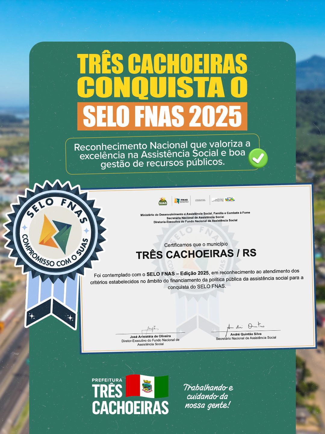Três Cachoeiras recebe Selo FNAS 2025 por desempenho na gestão da assistência social