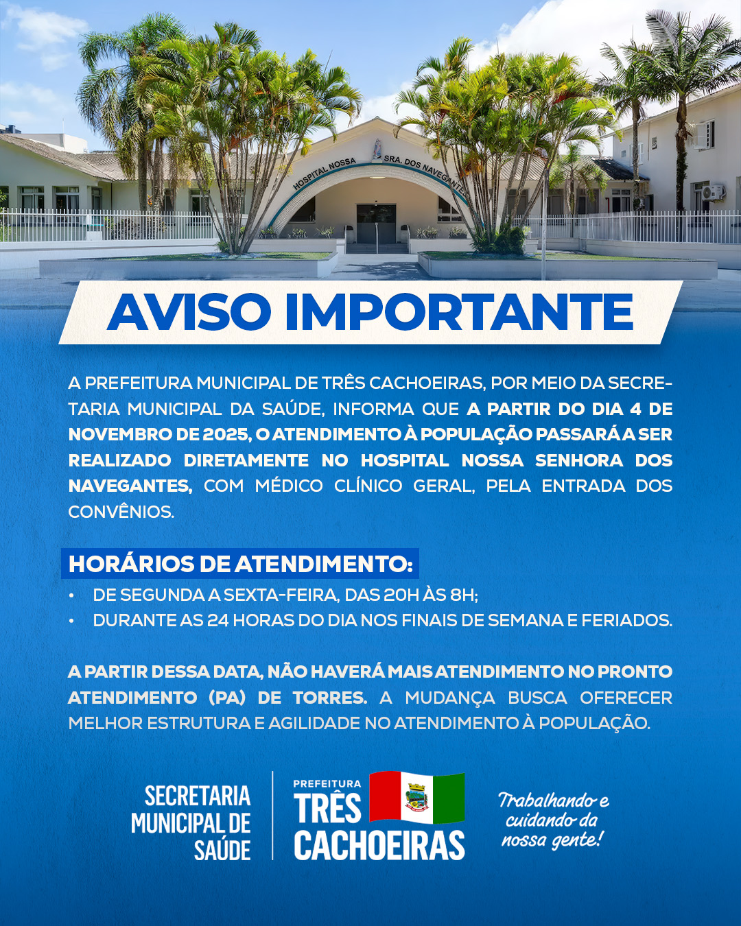 A Prefeitura Municipal de Três Cachoeiras, por meio da Secretaria Municipal da Saúde, informa que, a partir do dia 4 de novembro de 2025, o atendimento médico de urgência e emergência à população passará a ser realizado no Hospital Nossa Senhora dos Navegantes, em Torres. O serviço contará com médico clínico geral e será acessado pela entrada dos convênios do hospital.
