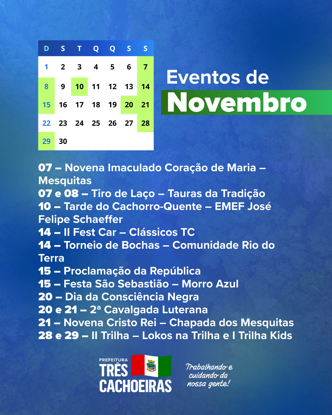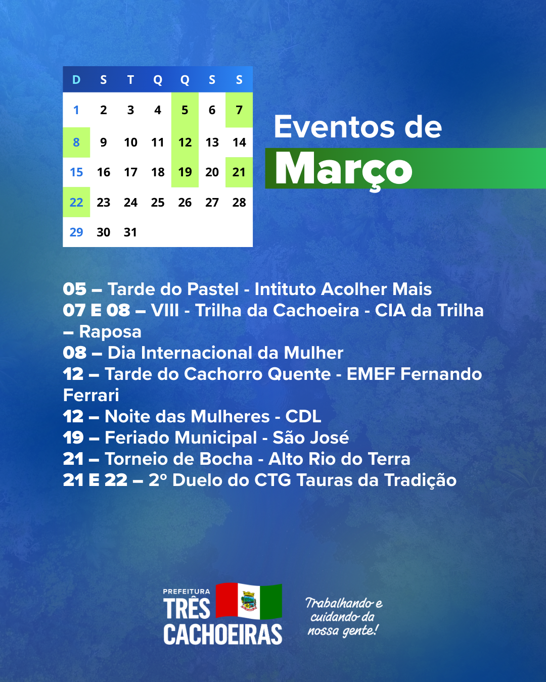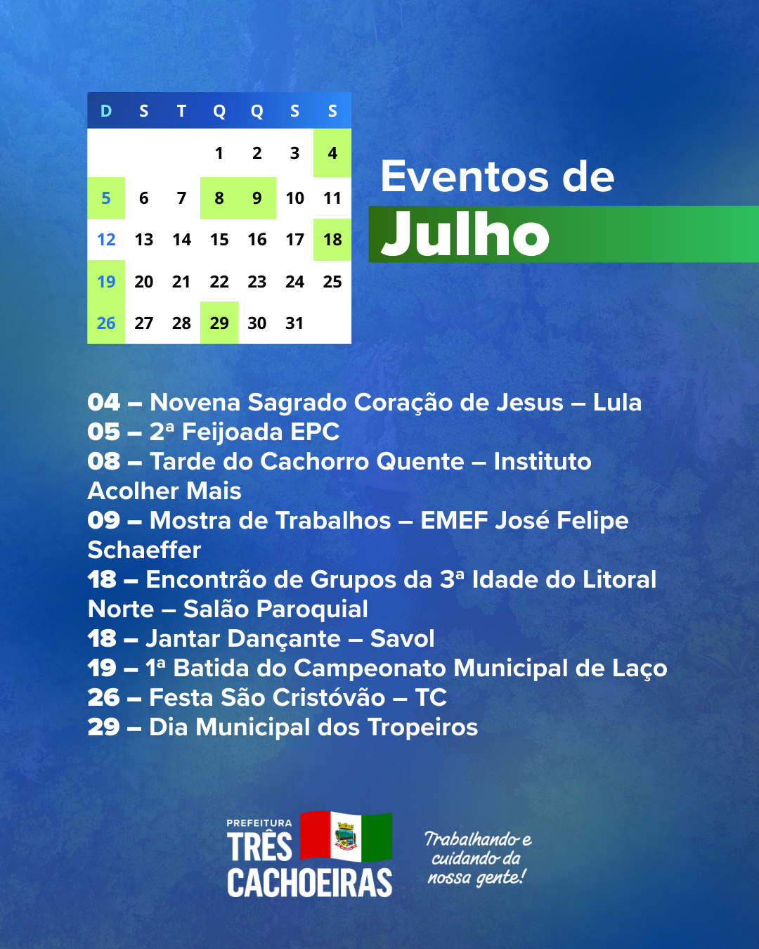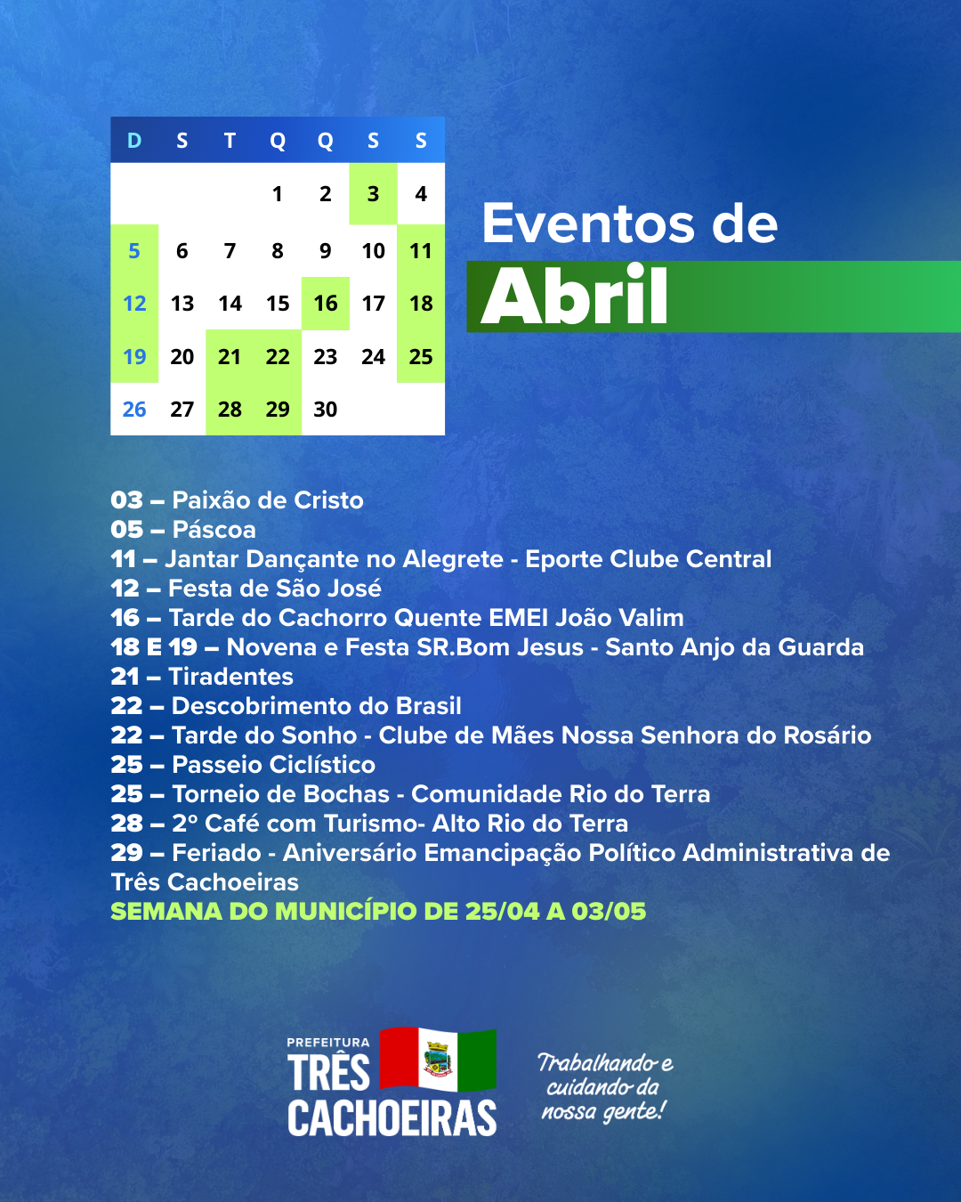 A Prefeitura de Três Cachoeiras apresenta o Calendário de Eventos 2026, construído em conjunto com a comunidade, com a programação de atividades culturais, esportivas, turísticas e sociais do município, além dos feriados e das principais datas comemorativas ao longo do ano.