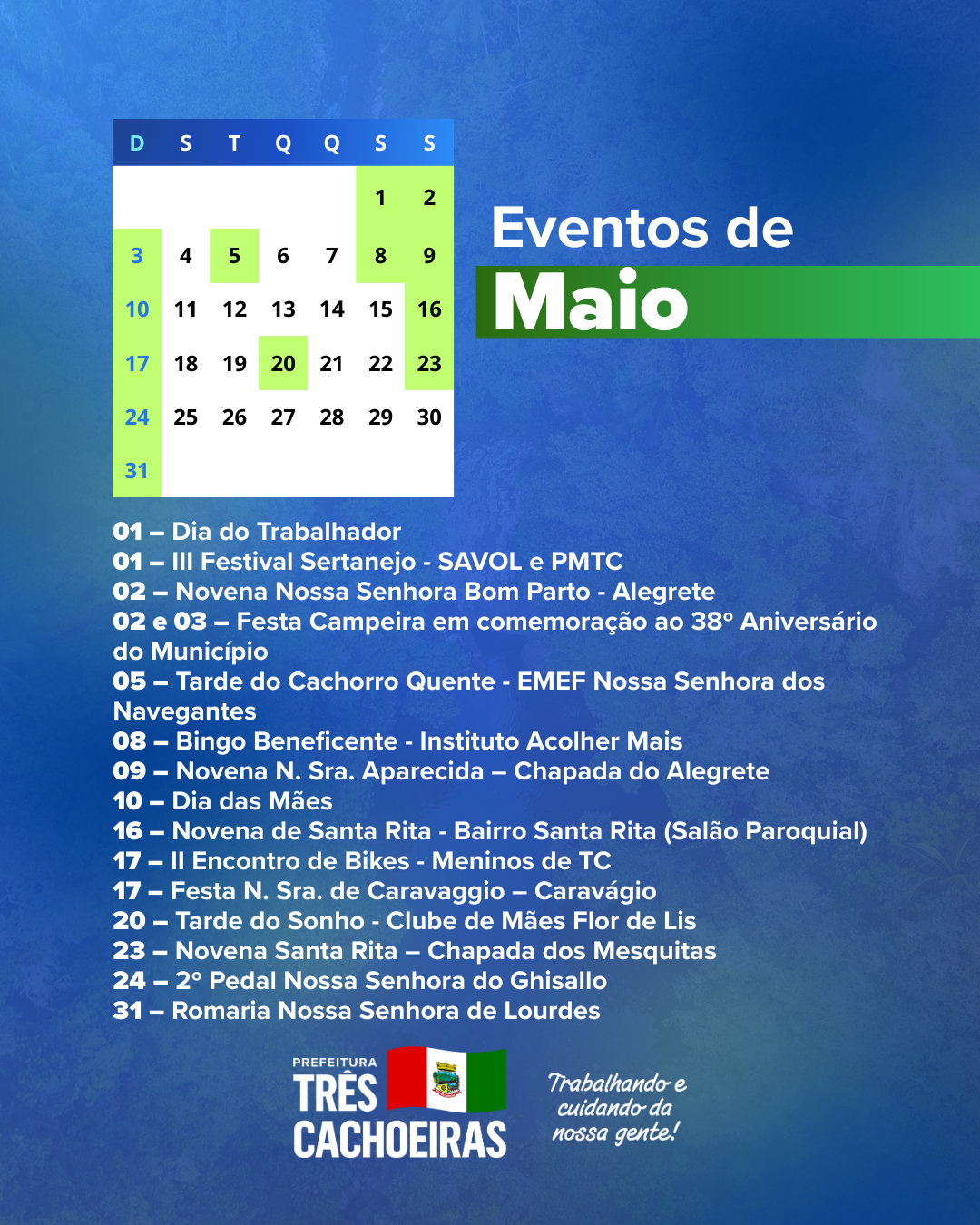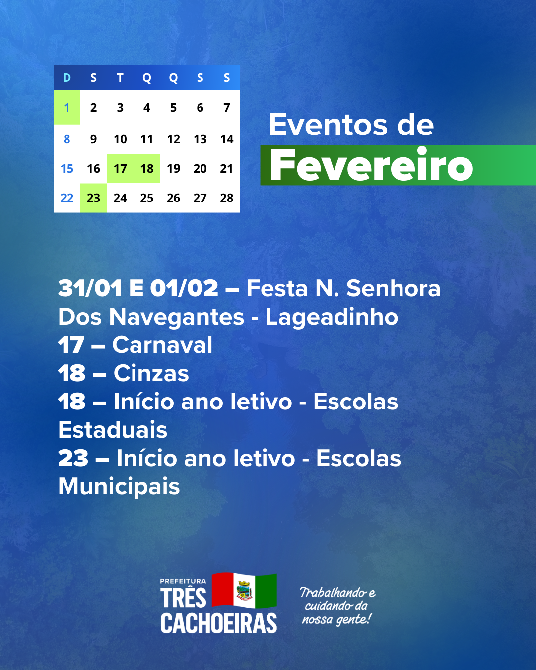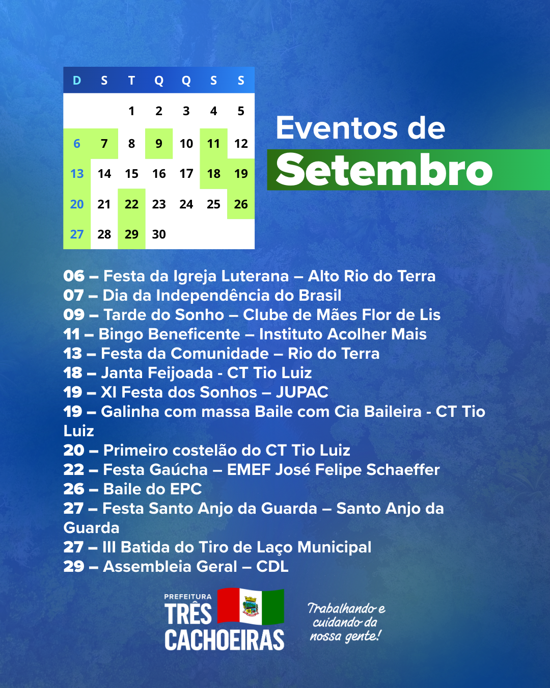 A Prefeitura de Três Cachoeiras apresenta o Calendário de Eventos 2026, construído em conjunto com a comunidade, com a programação de atividades culturais, esportivas, turísticas e sociais do município, além dos feriados e das principais datas comemorativas ao longo do ano.