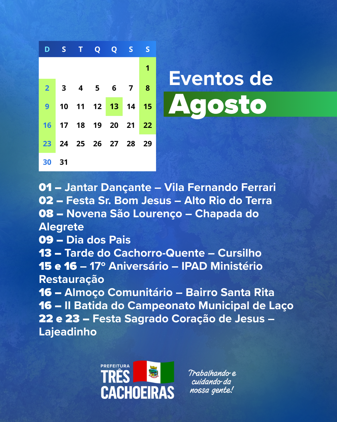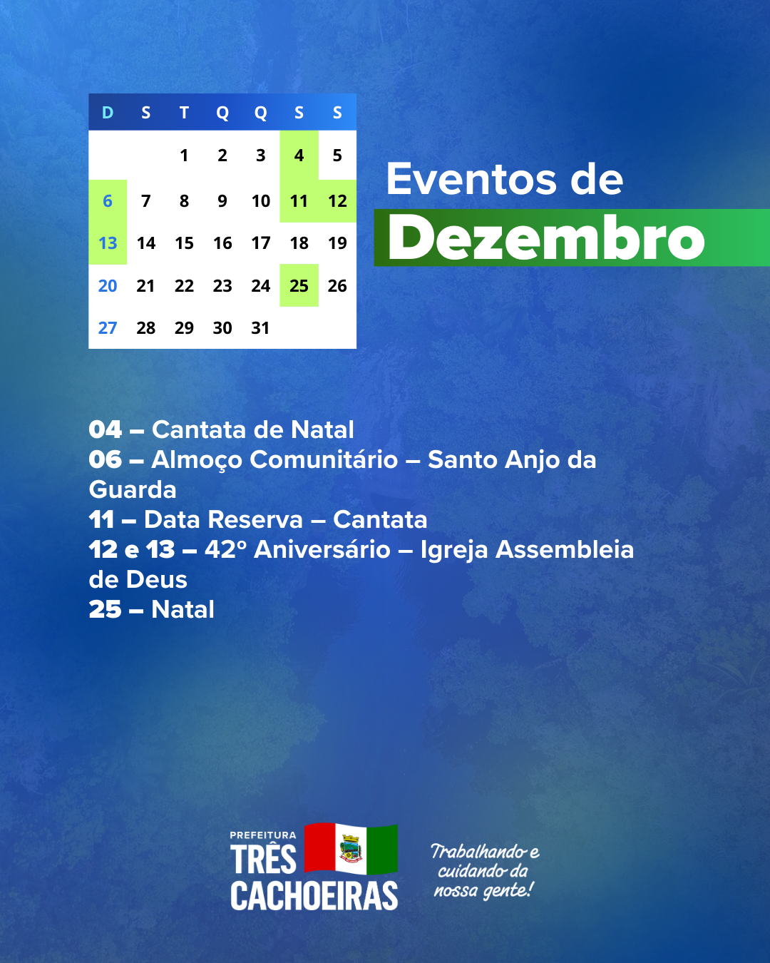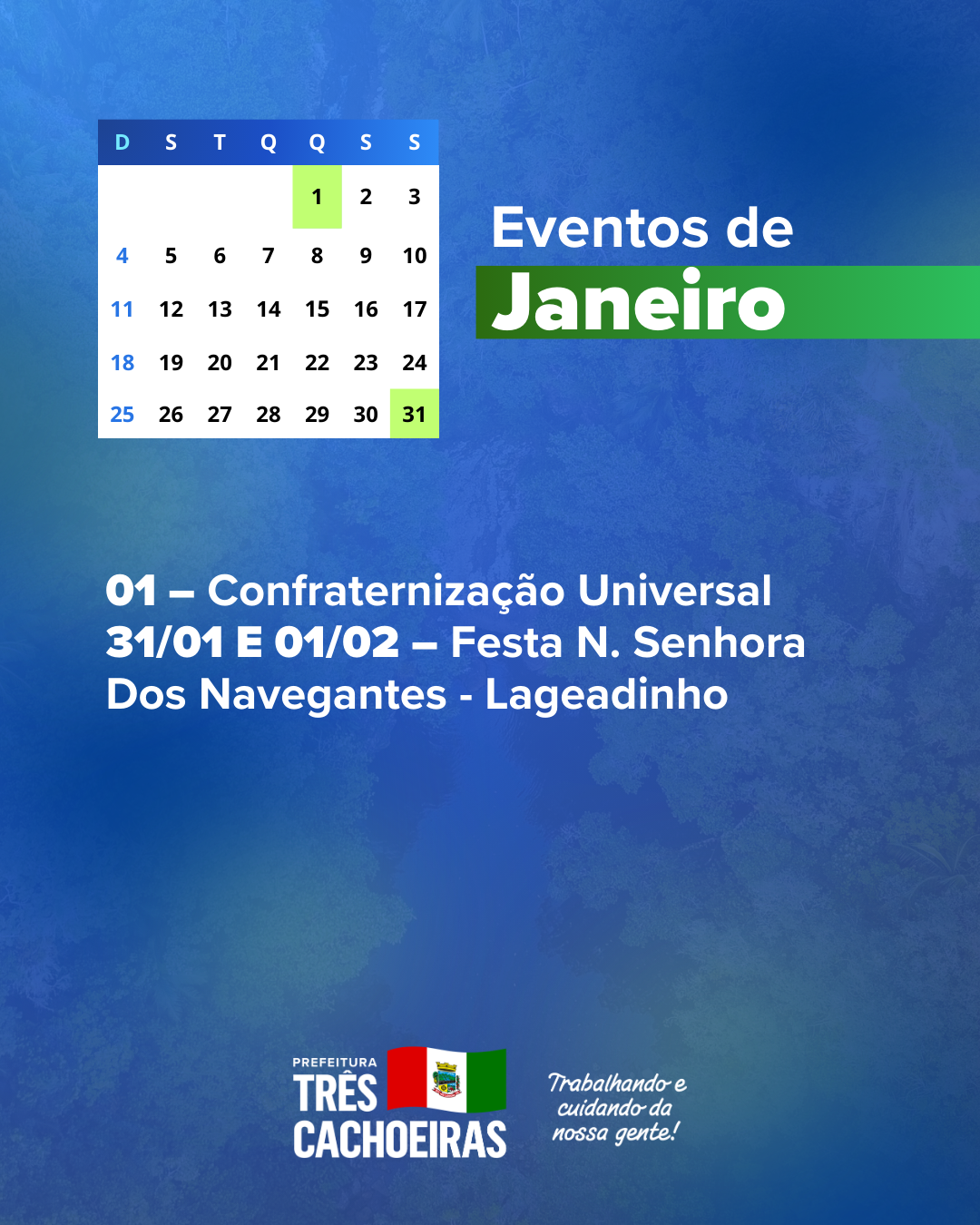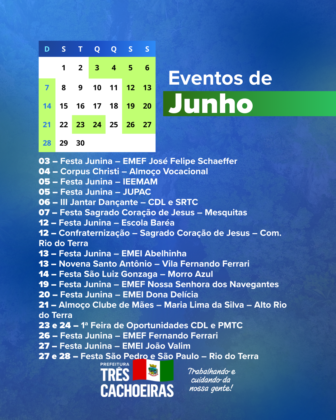 A Prefeitura de Três Cachoeiras apresenta o Calendário de Eventos 2026, construído em conjunto com a comunidade, com a programação de atividades culturais, esportivas, turísticas e sociais do município, além dos feriados e das principais datas comemorativas ao longo do ano.