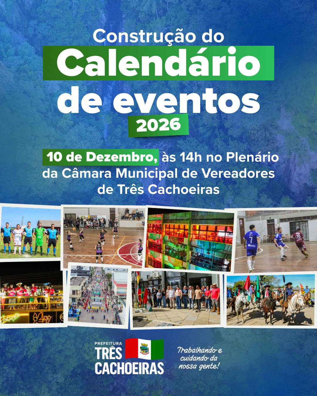A Prefeitura de Três Cachoeiras, por meio da Secretaria Municipal de Cultura e Turismo convida a todos para a construção do calendário de eventos 2026.