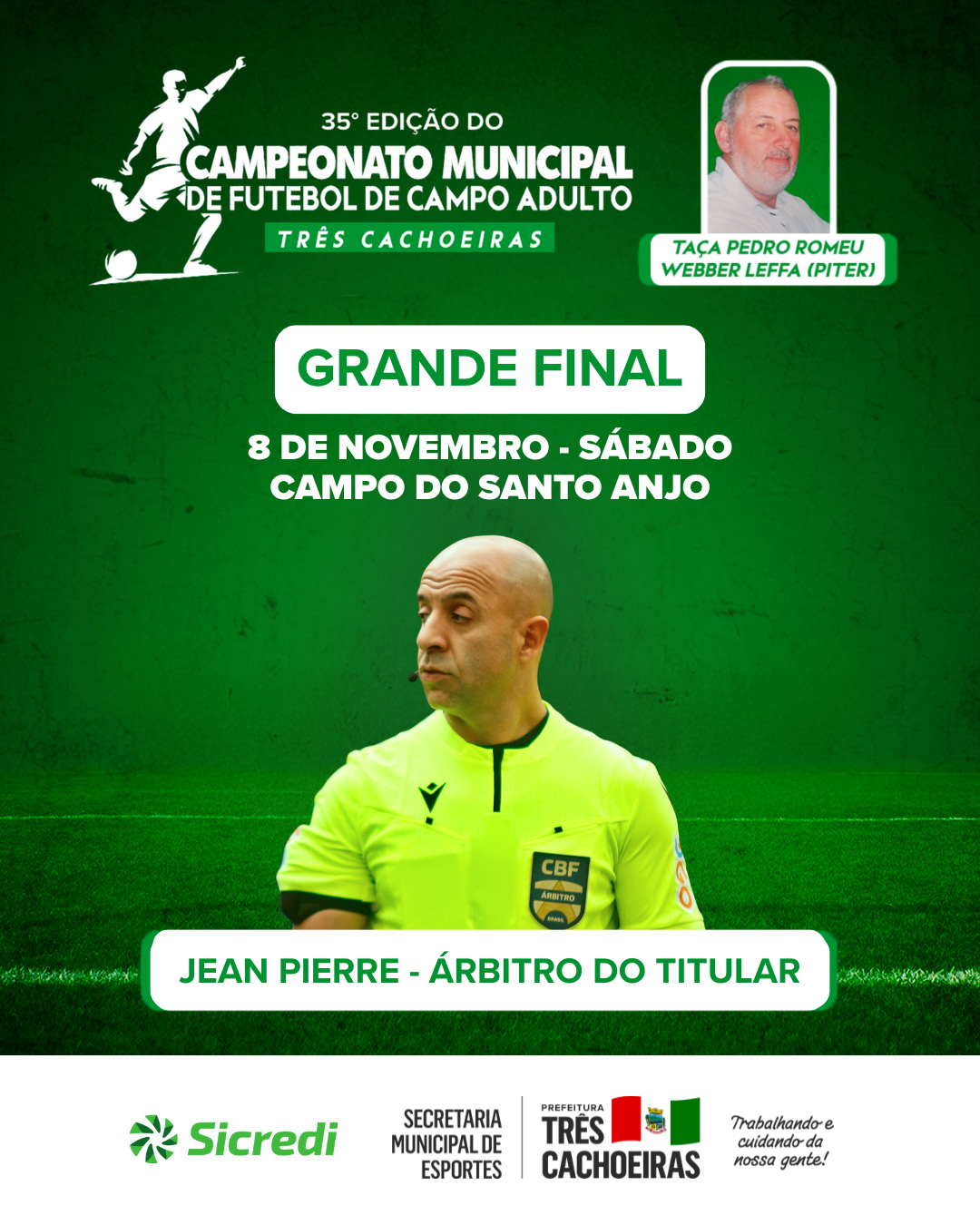 A 35ª edição do Campeonato Municipal de Futebol de Campo Adulto de Três Cachoeiras será concluída neste sábado, 8 de novembro, a grande final será disputada no Campo do Santo Anjo. Neste ano, a competição leva o nome de Taça Pedro Romeu Webber Leffa (Piter) em homenagem ao morador que contribuiu com o esporte no município.