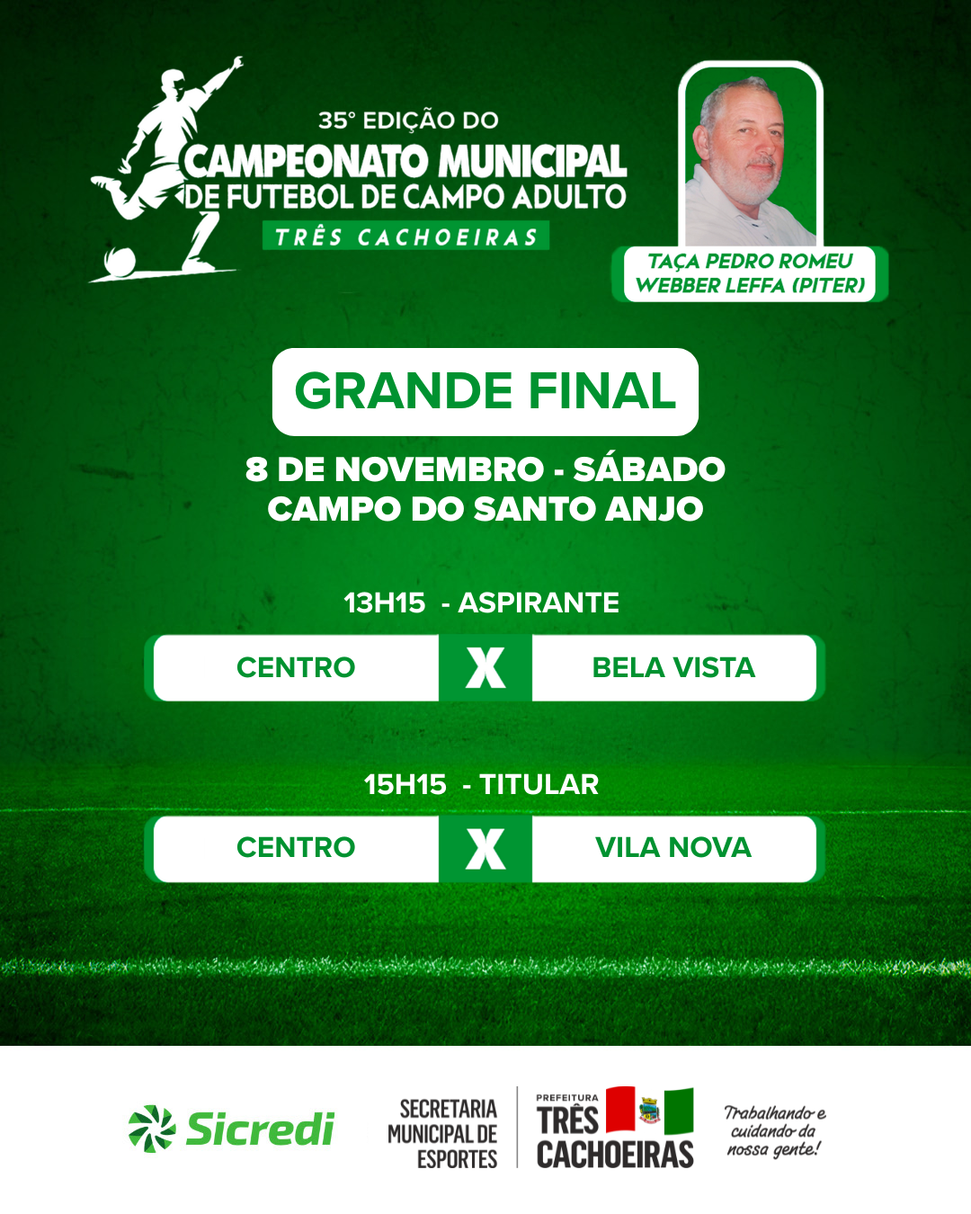 A 35ª edição do Campeonato Municipal de Futebol de Campo Adulto de Três Cachoeiras será concluída neste sábado, 8 de novembro, a grande final será disputada no Campo do Santo Anjo. Neste ano, a competição leva o nome de Taça Pedro Romeu Webber Leffa (Piter) em homenagem ao morador que contribuiu com o esporte no município.