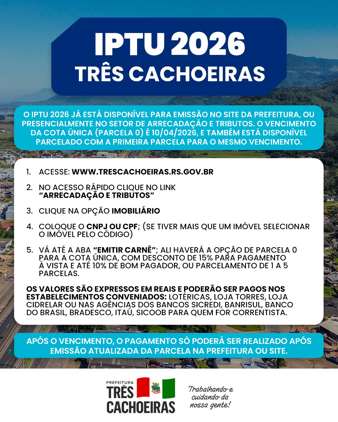 O IPTU 2026 já está disponível para emissão no site da prefeitura, ou presencialmente no setor de Arrecadação e Tributos. O vencimento da cota única (parcela 0) é 10/04/2026, e também está disponível parcelado com a primeira parcela para o mesmo vencimento.