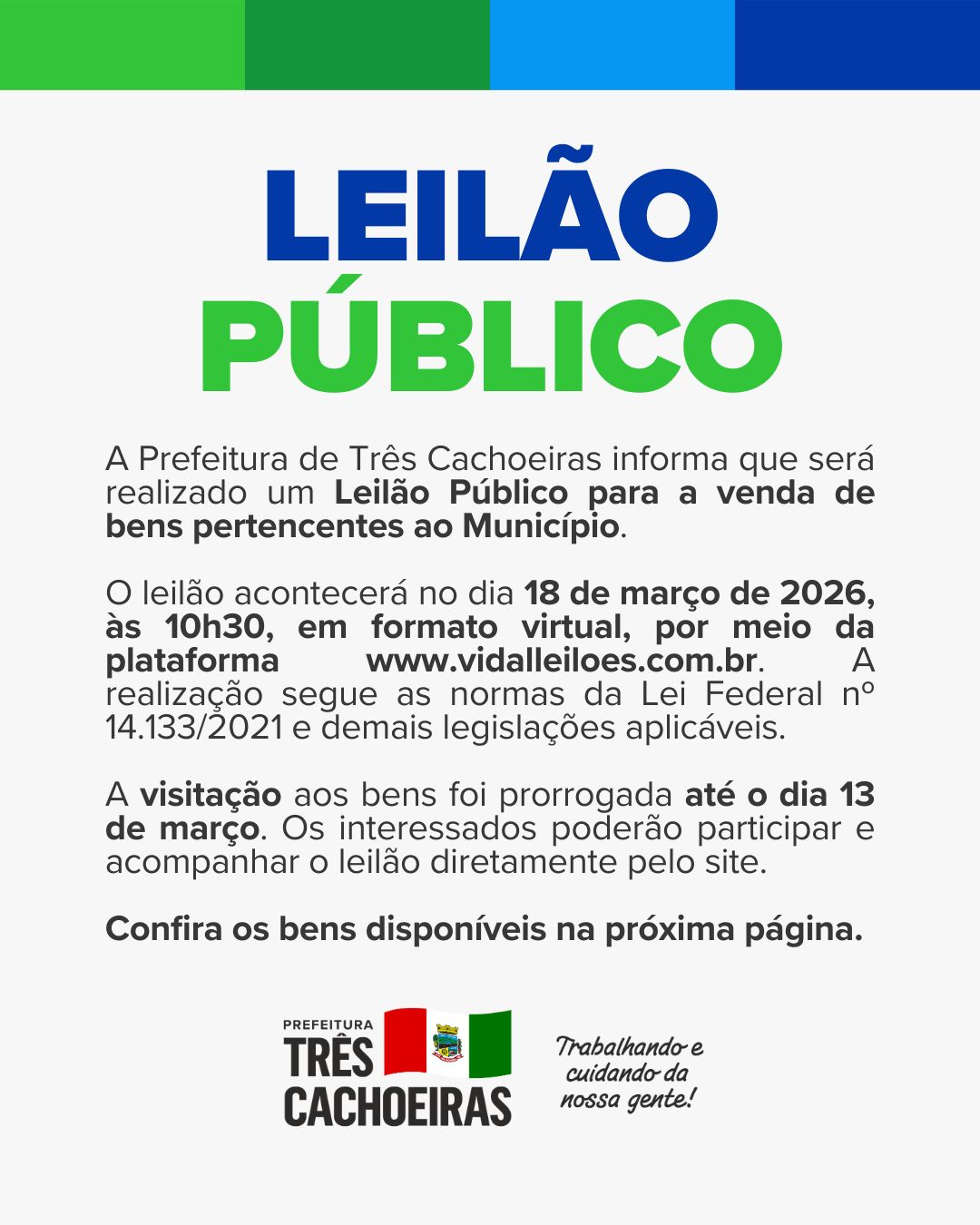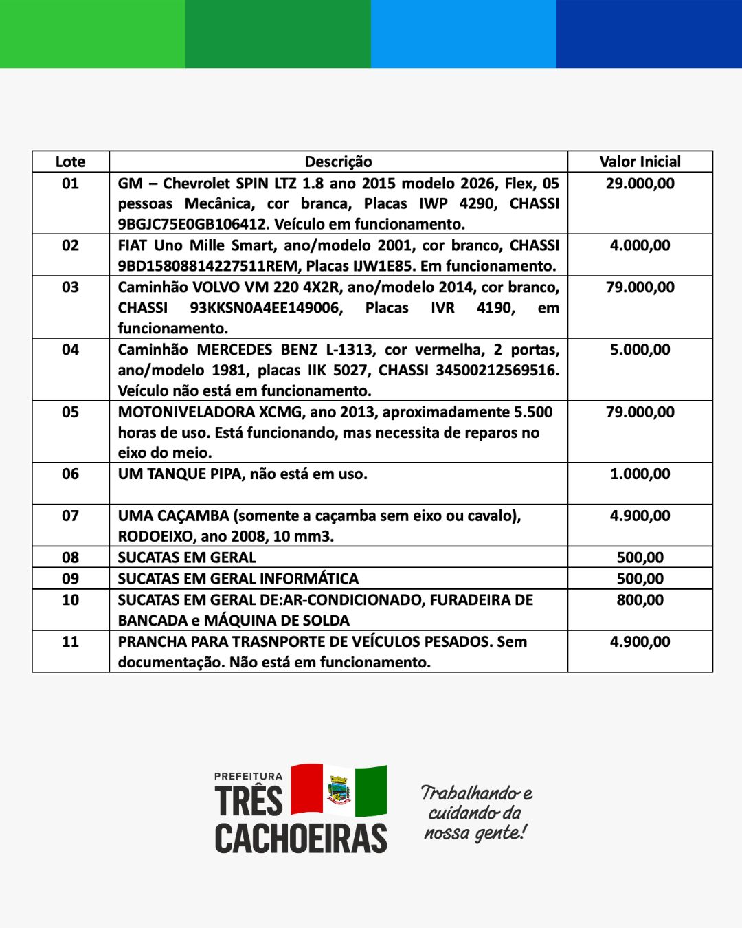 A Prefeitura de Três Cachoeiras informa que será realizado um Leilão Público para a venda de bens pertencentes ao Município.
