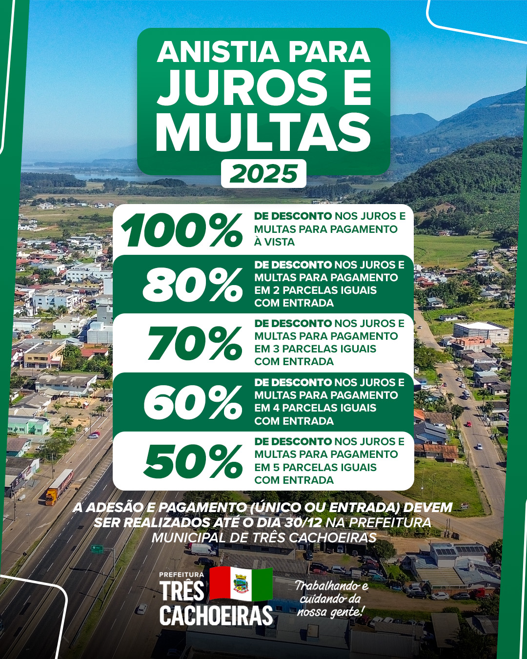 A Prefeitura de Três Cachoeiras lançou, nesta terça-feira (18), o programa de anistia de juros e multas para 2025, oferecendo condições especiais para que contribuintes regularizem seus débitos com o município. A adesão pode ser feita até o dia 30 de dezembro, diretamente na Prefeitura.